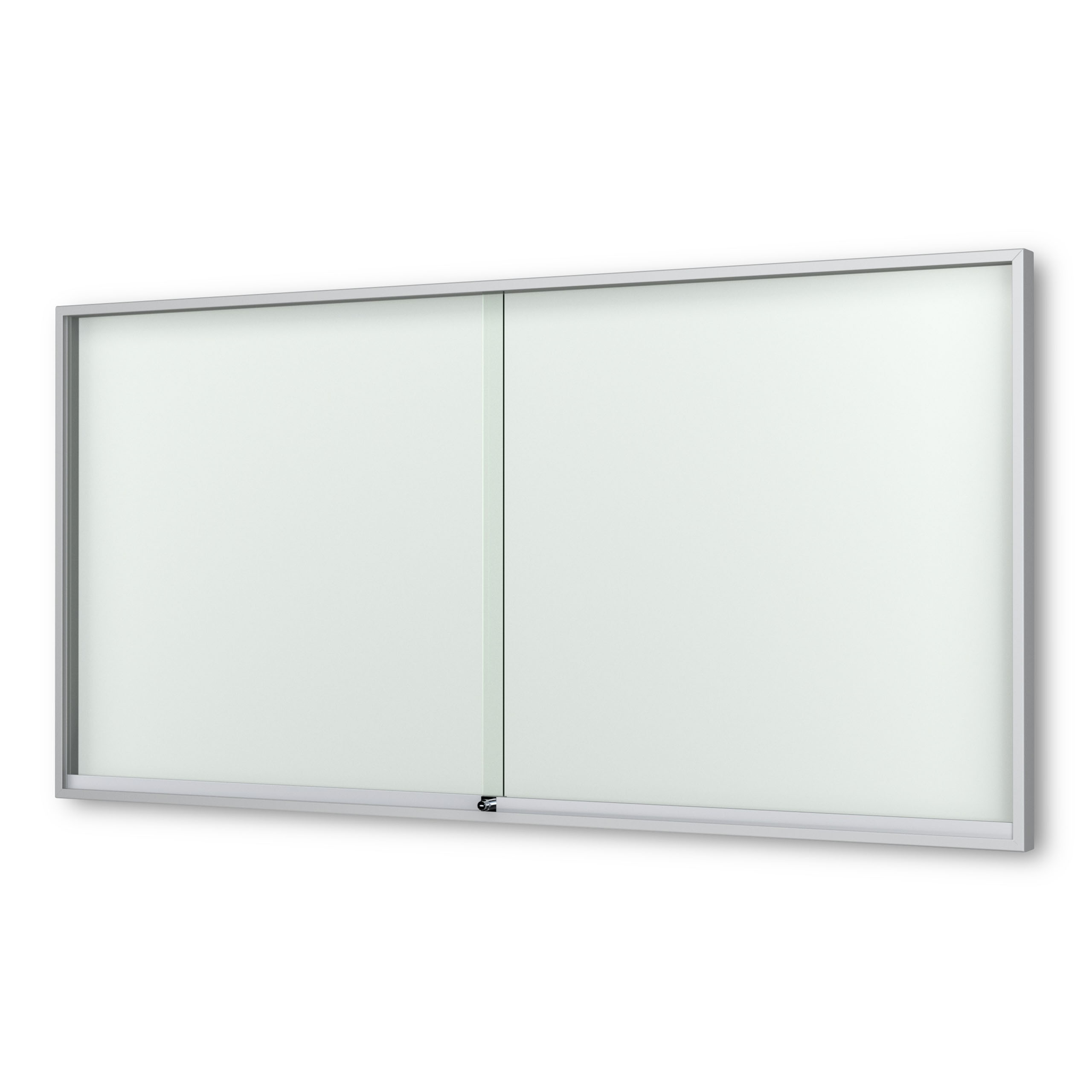 Schaukasten Fortis - eckig - mit Schiebetüren - 60 mm Gehäusetiefe, rollengelagerte Schiebetüren, höchster Brandschutz (A1) Größe - 8 × DIN A4 • 930 × 695 mm Öffnung - rollengelagerte SchiebetürenVerglasung - Einscheiben-Sicherheitsglas / ESGOberfläche - Eloxierung in matt-silber (E6/EV1)Beleuchtung - ohne BeleuchtungSchließung - Sicherheitsschlösser mit je 2 SchlüsselnRückwand - weiße, magnethaftende Rückwand inkl. 10 Magnete