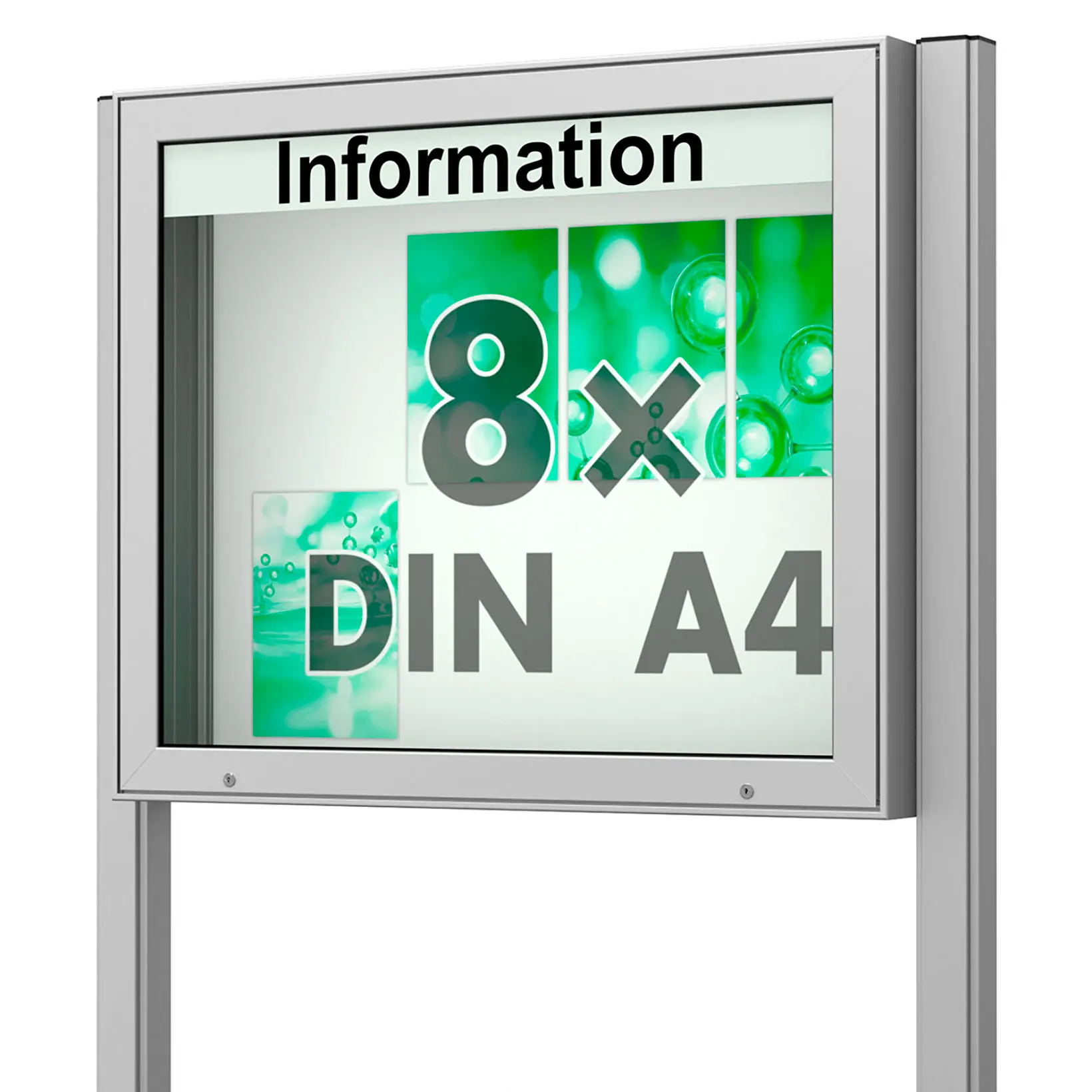 8 x DIN A4 Schaukasten Plenum eckig - der "Klassiker" mit Solar-Modul und Pfosten - Bautiefe 100mm