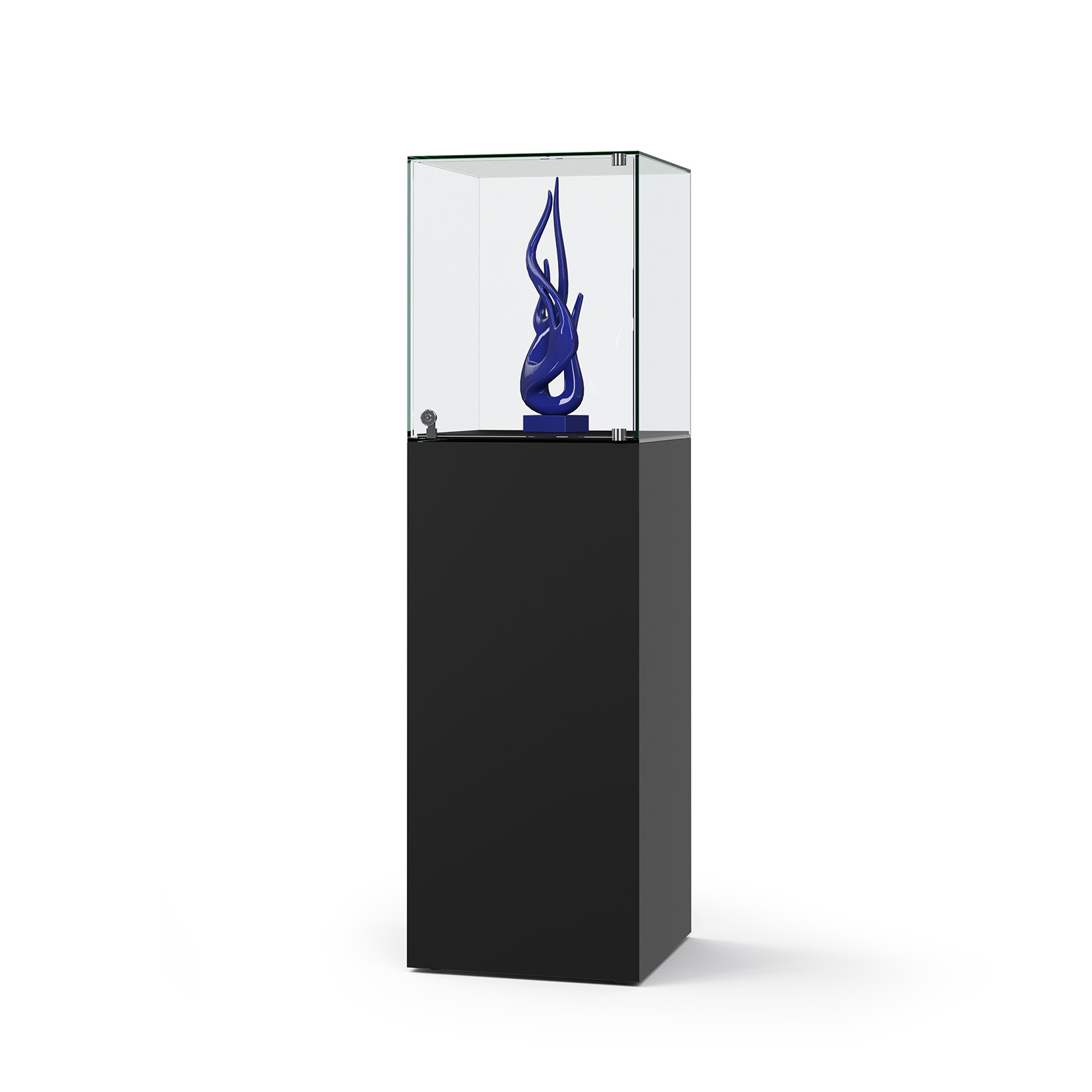 Haubenvitrine Exponat "SIGNUM |  ITALIEN SKY" - Design-Vitrine Das Modell SIGNUM | ITALIAN SKY gehört zu unseren Ganzglas-Ausstellungsvitrinen designed by Ute Bröker. In der eleganten Haubenvitrine fühlt sich ein hochwertiges Einzelexponat besonders wohl. Losgelöst von anderen Ausstellungsstücken und auf Augenhöhe des Betrachters positioniert, kann es ungehindert von allen Seiten betrachtet werden. ITALIAN SKY bietet sich für die Fälle an, in denen ein einzelnes Objekt frei im Raum in Szene gesetzt werden soll. Design-Haubenvitrine in Ganzglas-Bauweise mit farbig hinterdruckten Glasflächen ESG-Sicherheitsglas für alle außen liegenden Glasflächen Schwarze Glas-Fußplatte mit eleganten Aluminiumfüßen Logoeindruck auf Anfrage Höhe des Ausstellungsteils: 565 mmGlas-Fußplatte B x T: 620 x 420 mm, mit eleganten Aluminium-FüßenÖffnung: Seitliche Drehtür mit Sicherheitsschloss untenVerglasung: ESG-Sicherheitsglas bei allen außenliegenden GlasflächenGlasfachboden: 1 Glasfachböden im Ausstellungsteil und 1 Glasfachboden im Unterschrankaus ESG-Sicherheitsglas, fest verklebt - max.Belastung ca. 10kg je Fachboden bei gleichmäßiger LastverteilungFarbe/Oberfläche: Hinterdruckte Farbflächen wahlweise in schwarz, grau  - optional in RAL-FarbtönenVerschlusstechnik: 1 Sicherheitsschloss mit 2 Schlüsseln